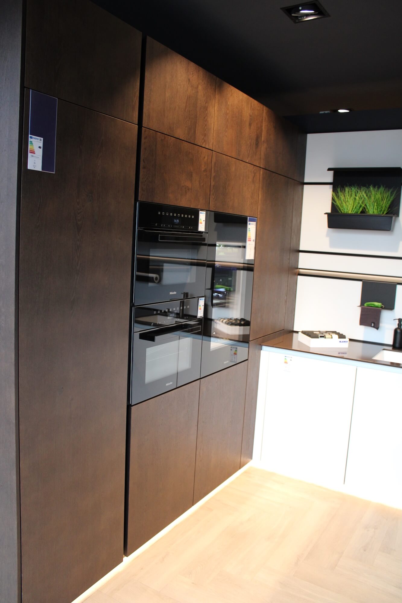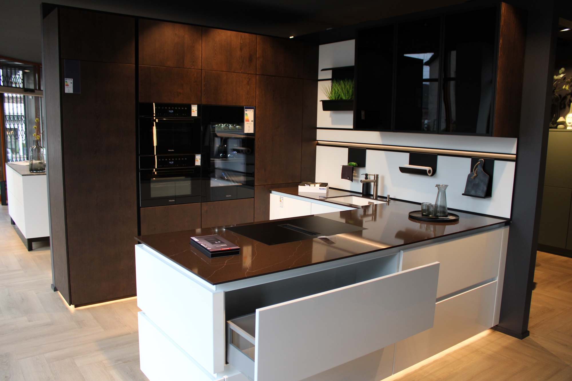 Diese U-Küche aus dem Programm Gala/Rocca begeistert mit einem edlen Materialmix: Weiß Hochglanzlack kombiniert mit Maron gebürstet – modern, warm und sehr hochwertig. Stilvolle Akzente mit abgedunkeltem Glas sowie eine perfekte Schrankbeleuchtung sorgen für ein besonders elegantes Gesamtbild.