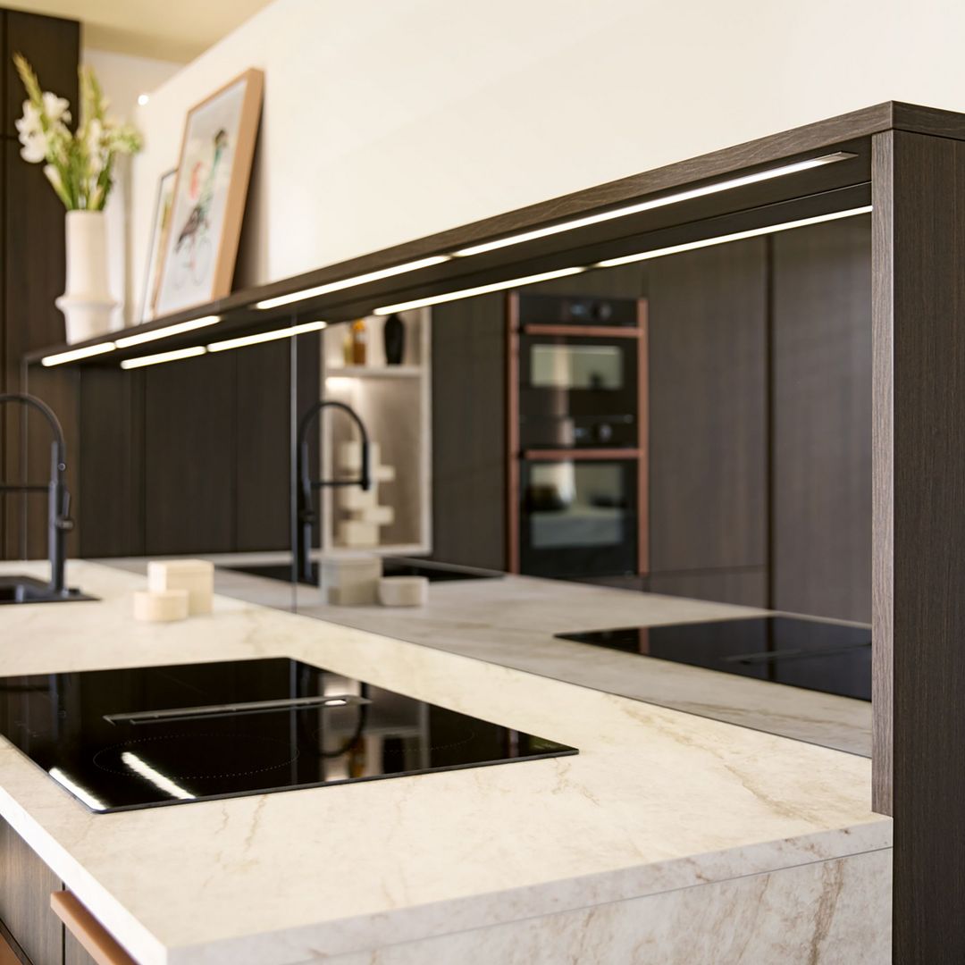 Die Spiegelglasnische Küche setzt einen besonderen Akzent bei der Designküche Varese. Die innovative Nische kombiniert reflektierende Flächen mit gezielter Beleuchtung, was nicht nur optisch Weite schafft, sondern auch die elegante Ästhetik der Küche unterstreicht. In Kombination mit hochwertigen Materialien entsteht ein modernes Ambiente, das zeitgemäßes Design mit praktischer Nutzung verbindet und damit perfekt für alle ist, die Wert auf Liebe zum Detail legen und Funktionalität im Alltag schätzen.